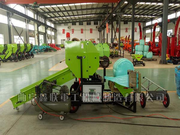 鑫联牌全自动上料青贮圆捆打包机具有包膜可靠密实、牧草膜拉伸性效果好、操作灵活方便、用膜节省,调节包膜层数方便、裹包草料外观为圆捆、并保证裹包草料在露天堆放2年以上等特点。