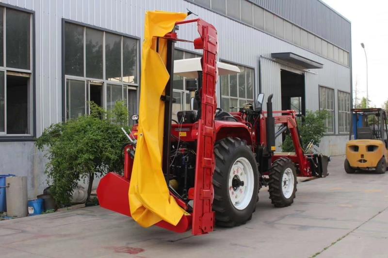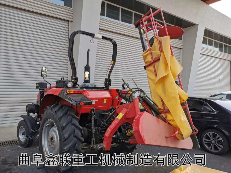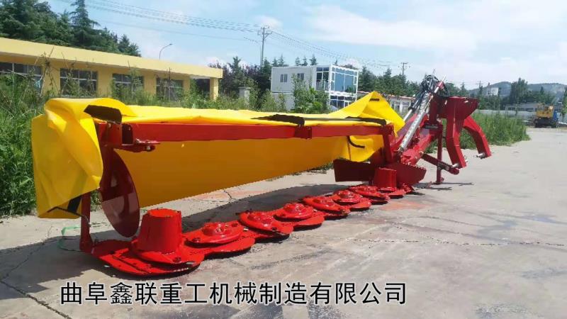 2、采用割草机连接到拖拉机后部悬挂牵引架,以动力输出轴带动作业。本机四个割刀盘的旋转,是由橡胶皮带(三角带)传动,使其机械结构简单,工作稳定性好,故障率低,维修成本低。