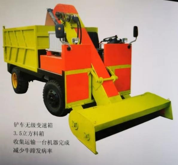 奶牛场清粪车,属于畜牧机械领域,规模化奶牛场清粪车中,车斗为上宽下窄的倒梯形结构,车斗的底为长方形,底盘包括底架、车轮、固定轴铰链、可拆轴铰链和牵引钩,4个车轮通过前后2个车轴置于长方形的底架两侧,车斗底的左边通过2个固定轴铰链与底架左梁构成转动连接,车斗底的右边通过1个可拆轴铰链与底架左梁构成能固定又能分离的连接,牵引钩固接在底架前梁上,当可拆轴铰链的销轴插从拆轴铰链中拔出,车斗在外力作用下在底盘上向后侧翻转。规模化奶牛场清粪车用于牛场清粪时,置于牛栏侧面的凹槽内,将牛粪推到车内后拉出清理。本实用新型使用方便、快捷,成本低,能大量的推广应用,适合规模化奶牛场使用。