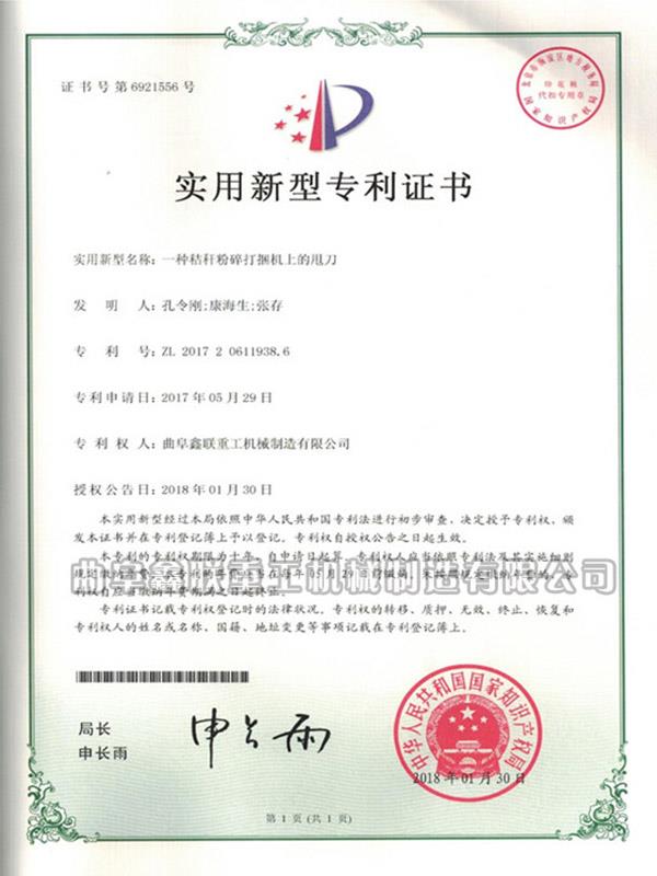 荣誉资质 > 实用新型-粉碎打捆机刀