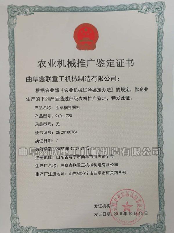 9YQ-1720型圆草捆打捆机推广鉴定证书